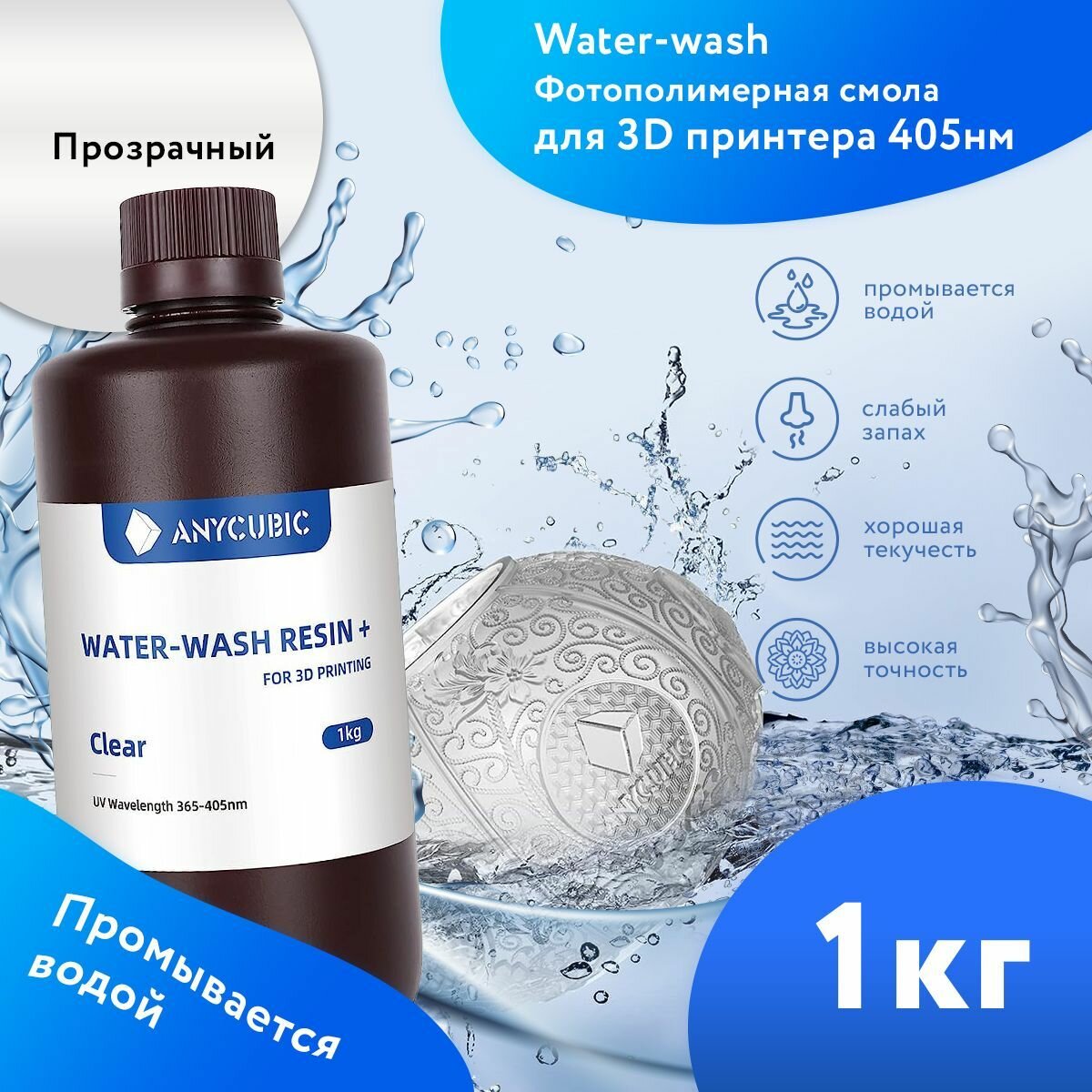 Фотополимерная смола Вода смываемая Anycubic Water-Wash Resin UV для 3Д принтеров LCD DLP 405нм , Прозрачная (Clear) , 1 литр