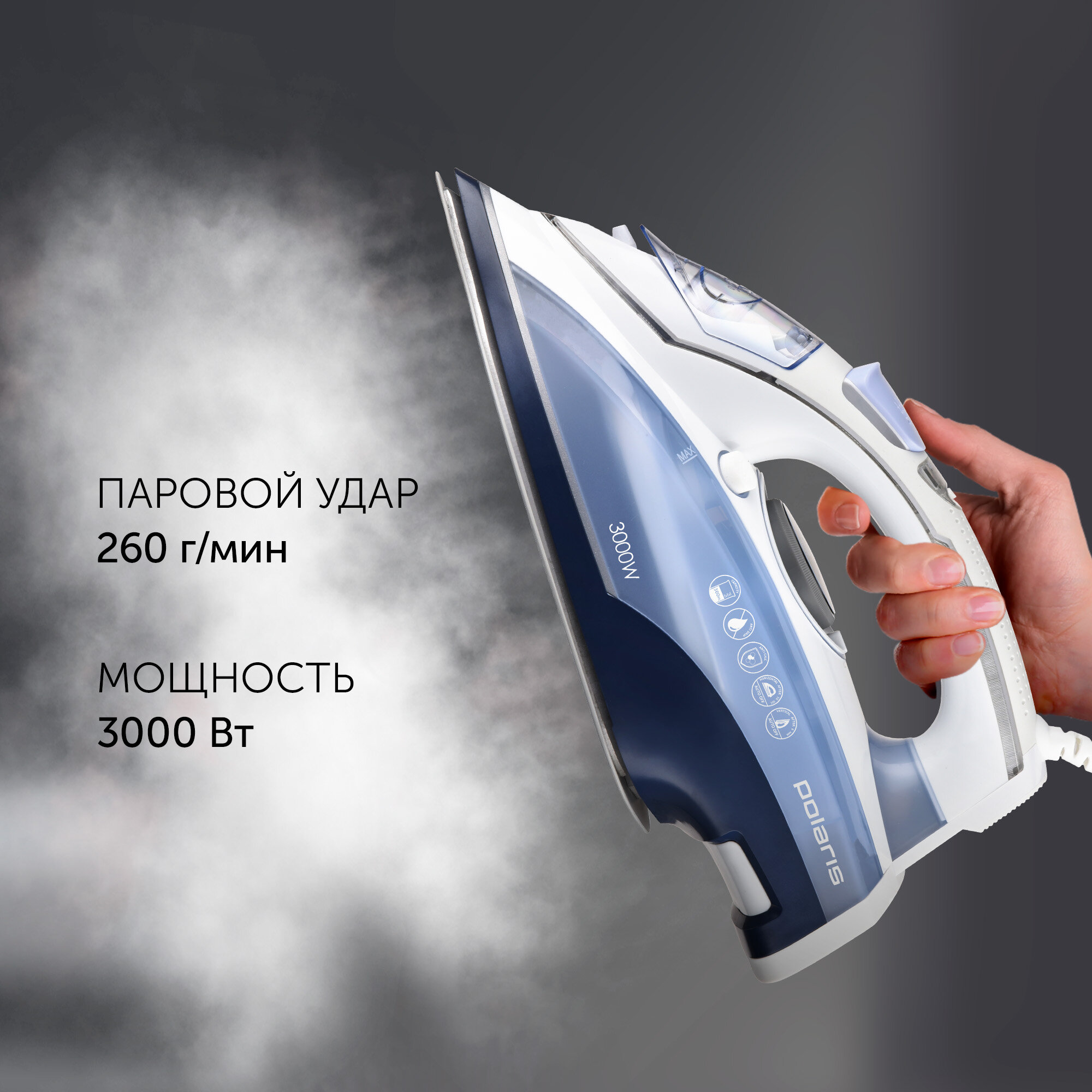 Паровой утюг Polaris PIR 3074 SG AA 3m, встроенный парогенератор, мощность 3000 вт, белый/голубой