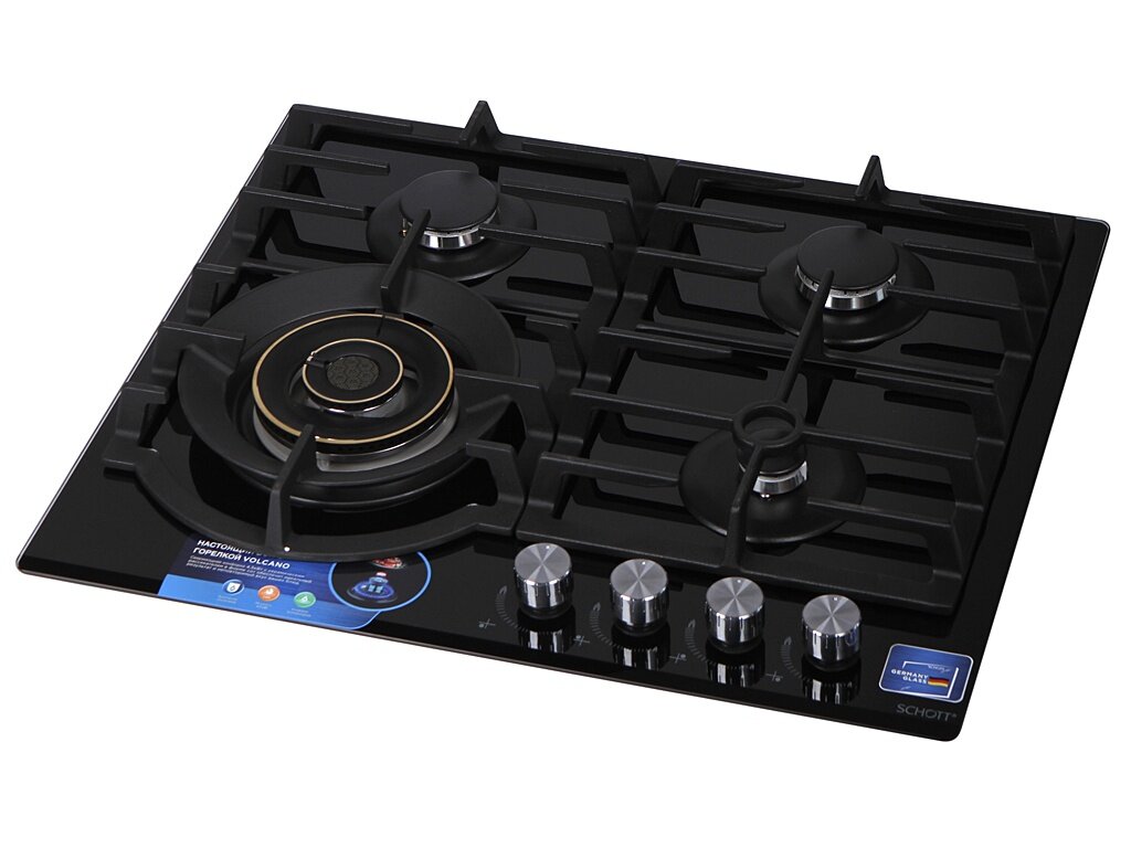 | Дополнительная информация | мощность конфорок: передняя правая - 1,0 кВт, задняя правая - 1,75 кВт, задняя левая - 1,75 кВт, передняя левая - 4,5 кВт; рабочая поверхность: закаленное стекло SCHOTT; сверхмощная конфорка Volcano; вес 14 кг; интегрированная подставка для турки |
