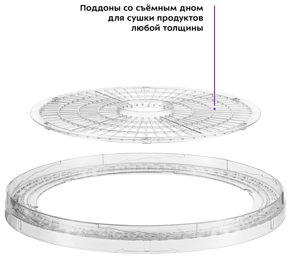 | Дополнительная информация | Комплектация 1. Сушилка для овощей и фруктов — 1 шт. 2. Поддон со съемным дном — 4 шт. 3. Поддон для вращения — 1 шт. 4. Крышка — 1 шт. 5. Руководство по эксплуатации — 1 шт. 6. Коллекционный магнит — 1 шт.* *опционально |