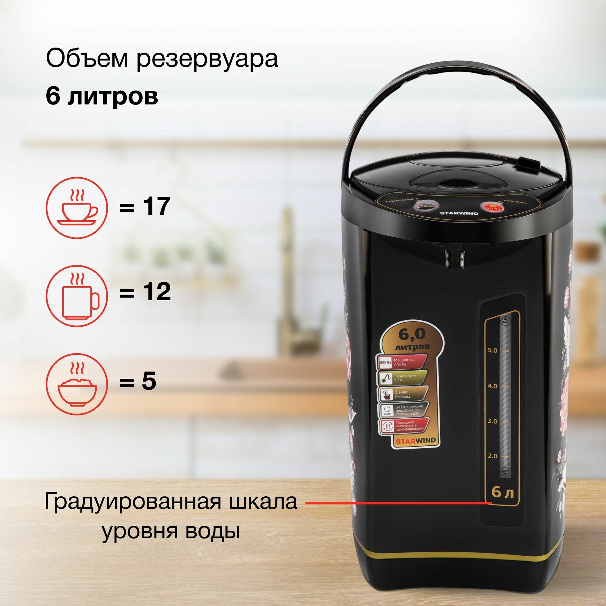 | Особенности | рисунок на корпусе / двойные стенки / вращение на 360 градусов / индикатор уровня воды / индикация включения / съемная крышка |