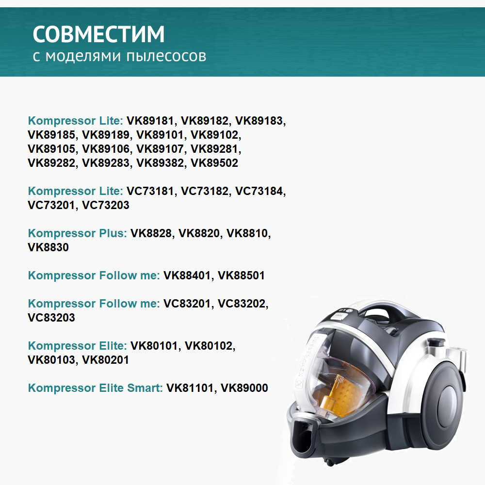 | Совместимые модели | Kompressor Lite: VK89181, VK89182, VK89183, VK89185, VK89189, VK89101, VK89102, VK89105, VK89106, VK89107, VK89281, VK89282, VK89283, VK89301, VK89302, VK89304, VK89380, VK89382, VK89482, VK89483, VK89502, Kompressor Lite: VC73181, VC73182, VC73183, VC73184, VC73185, VC73201, VC73203 Kompressor Plus: VK8828, VK8820, VK8810, VK8830, VC88888 Kompressor Follow me: VK88401, VK88501, Kompressor Follow me: VC83201, VC83202, VC83203, VC83204 Kompressor Elite: VK80101, VK80102, VK80103, VK80201. Kompressor Elite Smart: VK81101 VC73180NNTR, VC73184NHAR, VC73203UHAO, VK80101CVX, VK80101HFR, VK80102HX, VK80103HFX, VK80201CUNX, VK81101HF, VK8810HFNR, VK8810HUMR, VK8810HUV, VK8820HFN, VK8820HMR, VK8820HU, VK8820HUV, VK8828HQ, VK8830HTXR, VK88401HF, VK88501HF, VK89101HQ, VK89102HU, VK89105HQ, VK89106HU, VK89181N, VK89182NU, VK89183H, VK89183N, VK89185HU, VK89189HMV, VK89281R, VK89282R, VK89283RU, VK89502HU, VK9820UHAT, VK7920 |