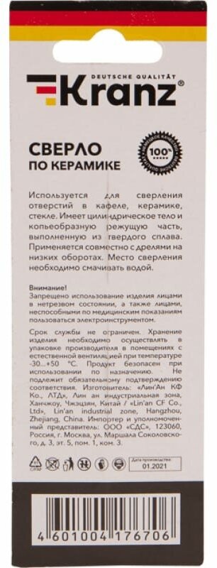 Сверло по стеклу и керамике KRANZ KR-91-0643