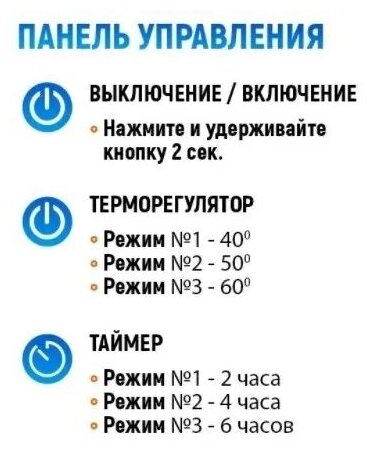 | Плюсы: | Хорошо сделан, сварные швы аккуратные. Таймер отключения (на 2/4/6 часов) и регулятор температуры (на три уровня мощности) есть, всё работает |