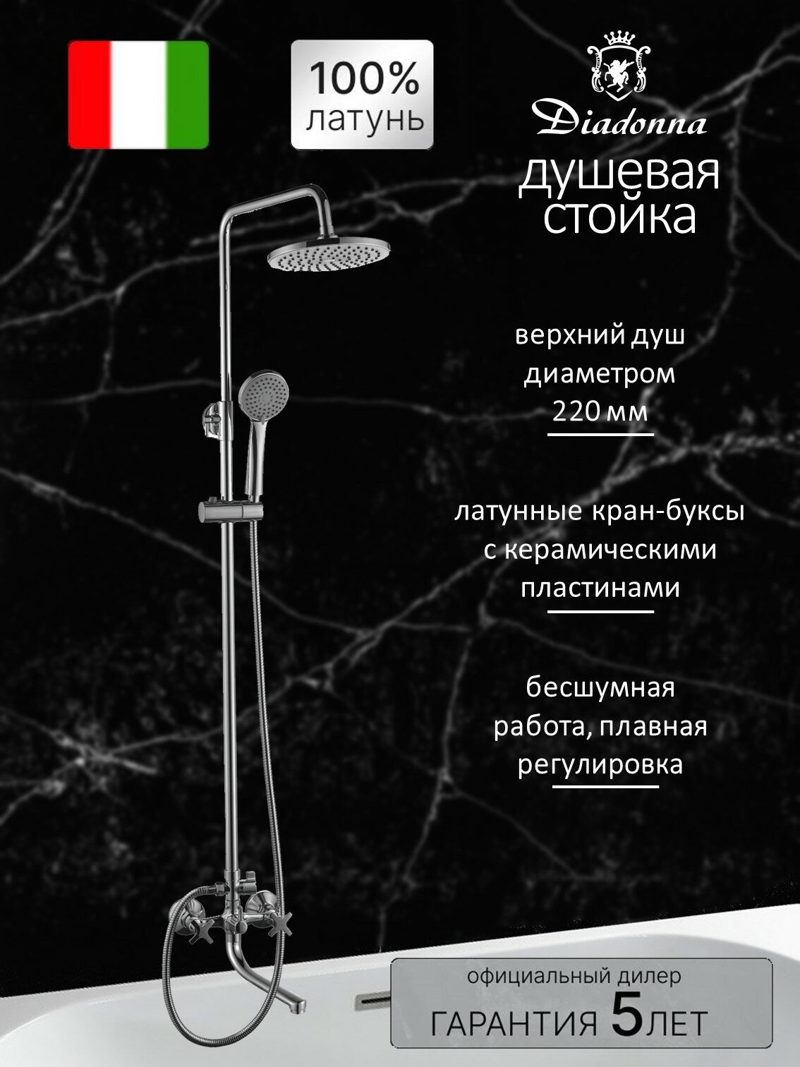 Душевая стойка Diadonna D80-335351 с изливом, верхним душем, лейкой, керамические кран-буксы, хром интересное: