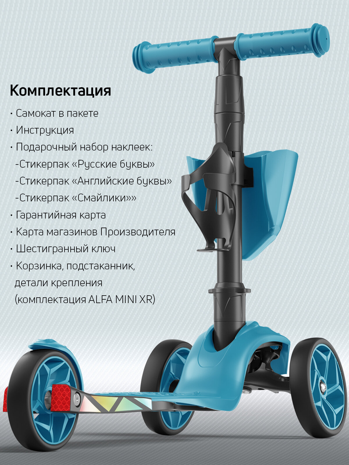 Самокат, самокат трехколесный детский, с корзинкой и подстаканником для бутылок, Alfa Mini, голубой флюр