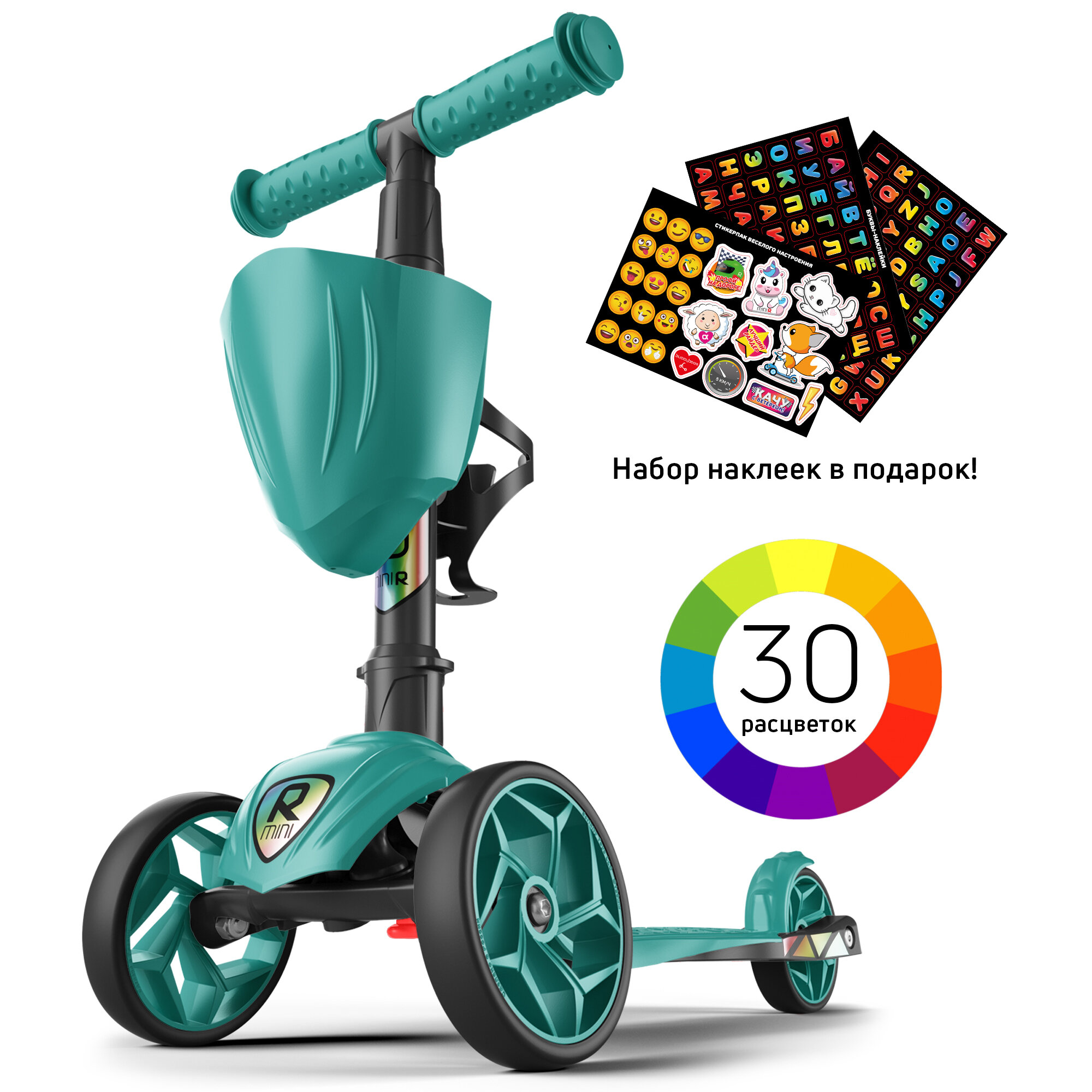Самокат детский трехколесный с корзинкой, подстаканником для бутылок и наклейками
