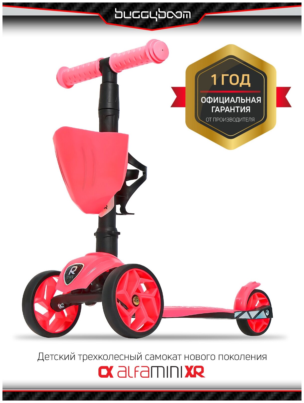 Cамокат трехколесный детский BuggyBoom Alfa Mini XR с корзинкой и подстаканником для бутылок, розовый 004-8057