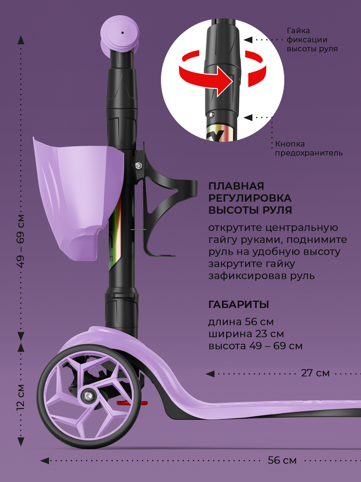 Самокат, самокат трехколесный детский, с корзинкой и подстаканником для бутылок, Alfa Mini, фиолетовый