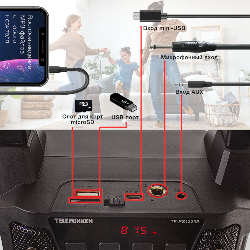 | Особенности | поддержка microSD / ручка / световые эффекты / дисплей / FM-радио / караоке |