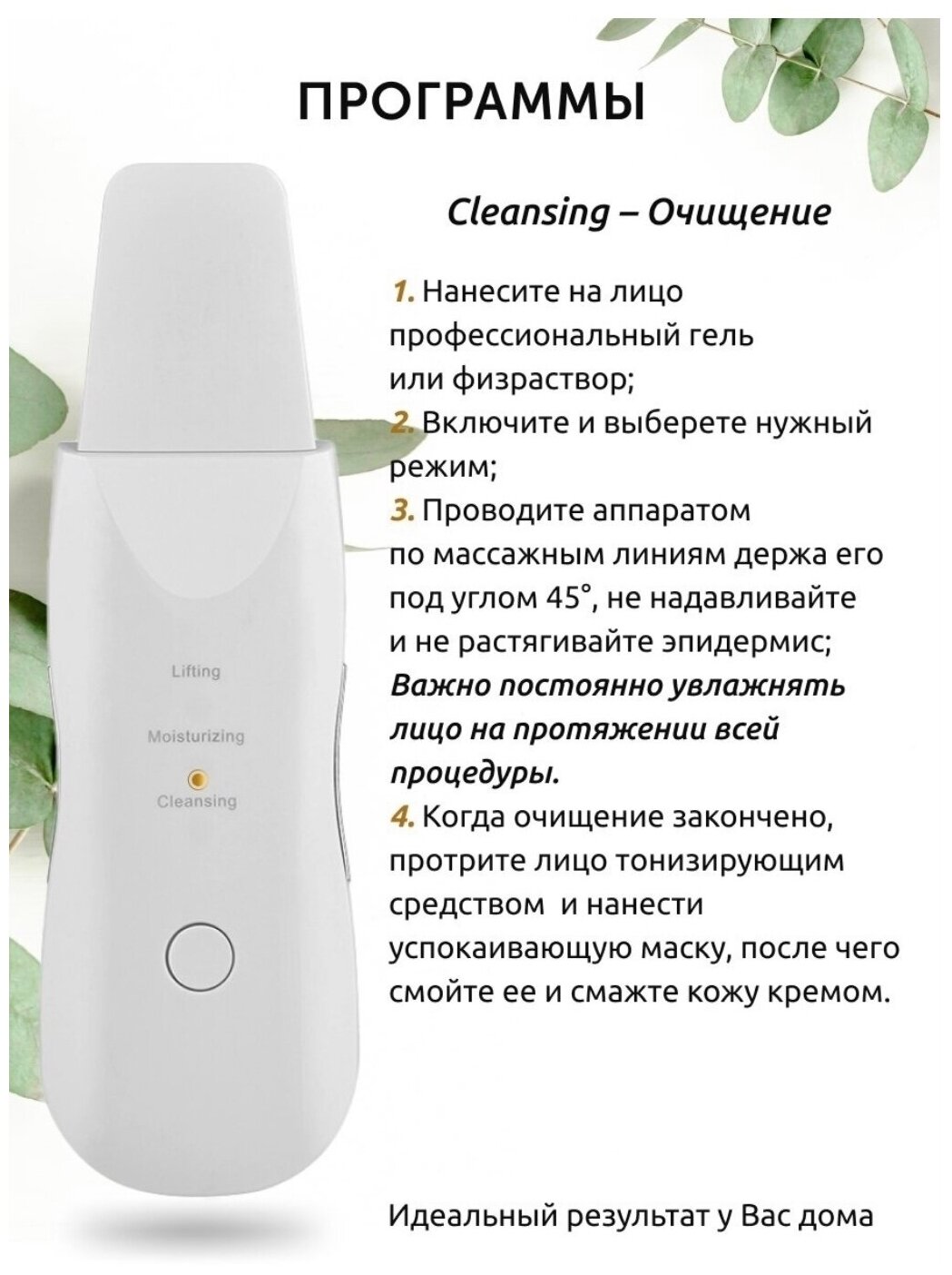 | Назначение | массаж / пилинг / очищение / увлажнение / антивозрастной уход / лечение акне |