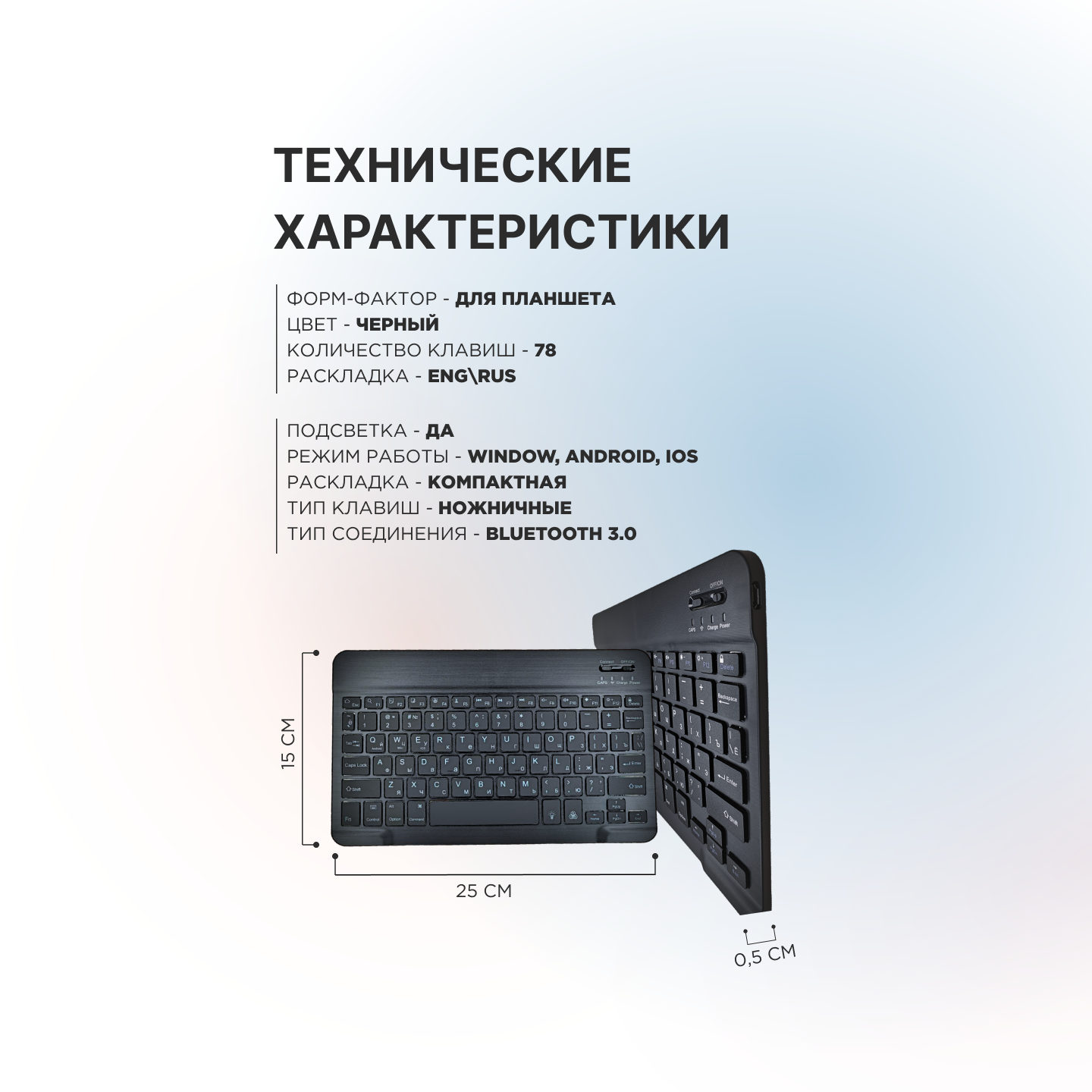 | Комплектация | 1 - Bluetooth клавиатура. 2 - Кабель зарядки micro-usb |