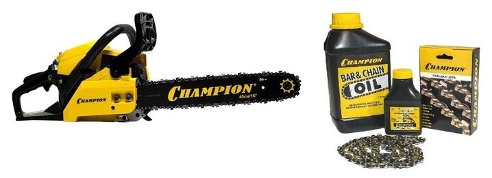 Бензопила цепная бензиновая CHAMPION 237-16 + масло для цепи, свеча, смазка и цепь