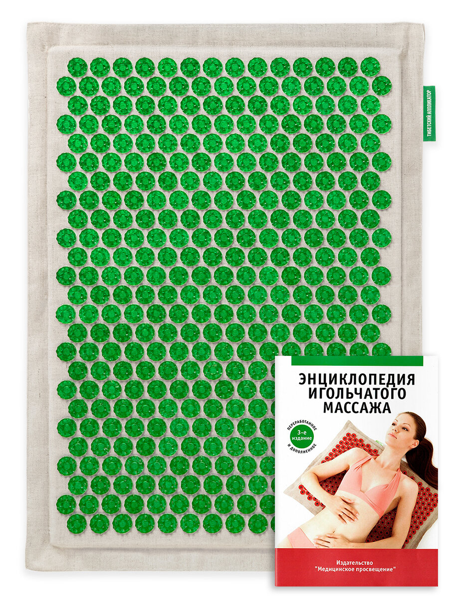 Аппликатор Кузнецова. Тибетский акупунктурный массажный коврик акупунктурный 41х60 см., массажер на мягкой подложке 2 см., зеленый (менее острые иглы). Цвет ткани - "натуральный лён".