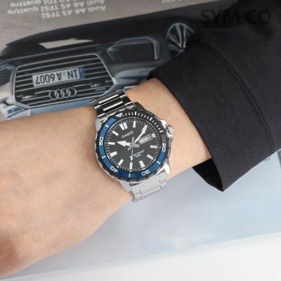 MTD-125-2A Casio наручные часы кварцевые WR100 (10 атм) мужские синий, хром отображение дня недели, отображение числа поворотный безель, подсветка стрелок минеральное стекло
