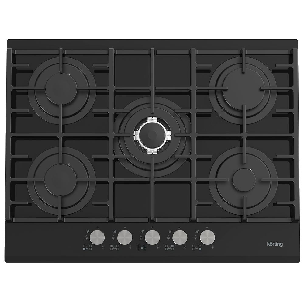 Встраиваемая газовая панель Korting/ Газовая варочная панель из закаленного стекла, ширина 70 см, 5 высокоэффективных конфорок, сверхмощная конфорка WOK 3,8 кВт, автоматический электроподжиг, газ-контроль каждой конфорки, передние металлические переключат