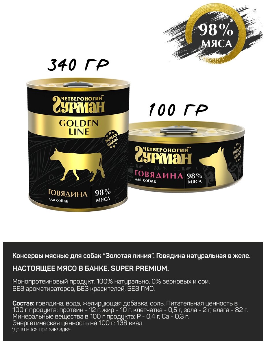 Консервы для собак Четвероногий Гурман Golden line, говядина натуральная, 340г