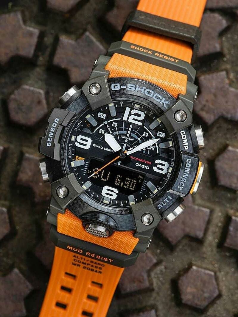 | Плюсы: | Хороший яркий дизайн, от которого не несет "классическим" g-shock-ом за километр (не особый их любитель), номинально богатая функциональность, довольно-таки удобные несмотря на огромный размер (у кого не очень большая рука, но нравятся большие часы — самое оно). Шагомер, компас, термометр, секундомер, время рассвета-заката — отличные часы для прогулок по лесным болотам в компании собаки и фотокамеры. Mudmaster, короче, название оправдывает. |