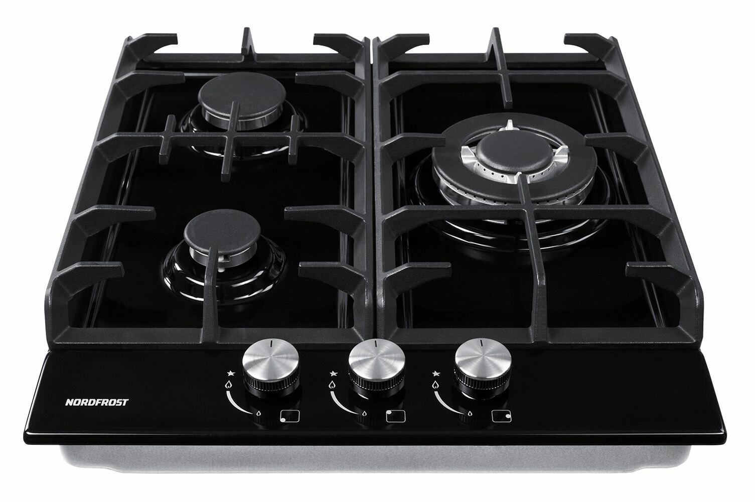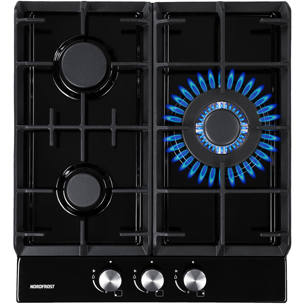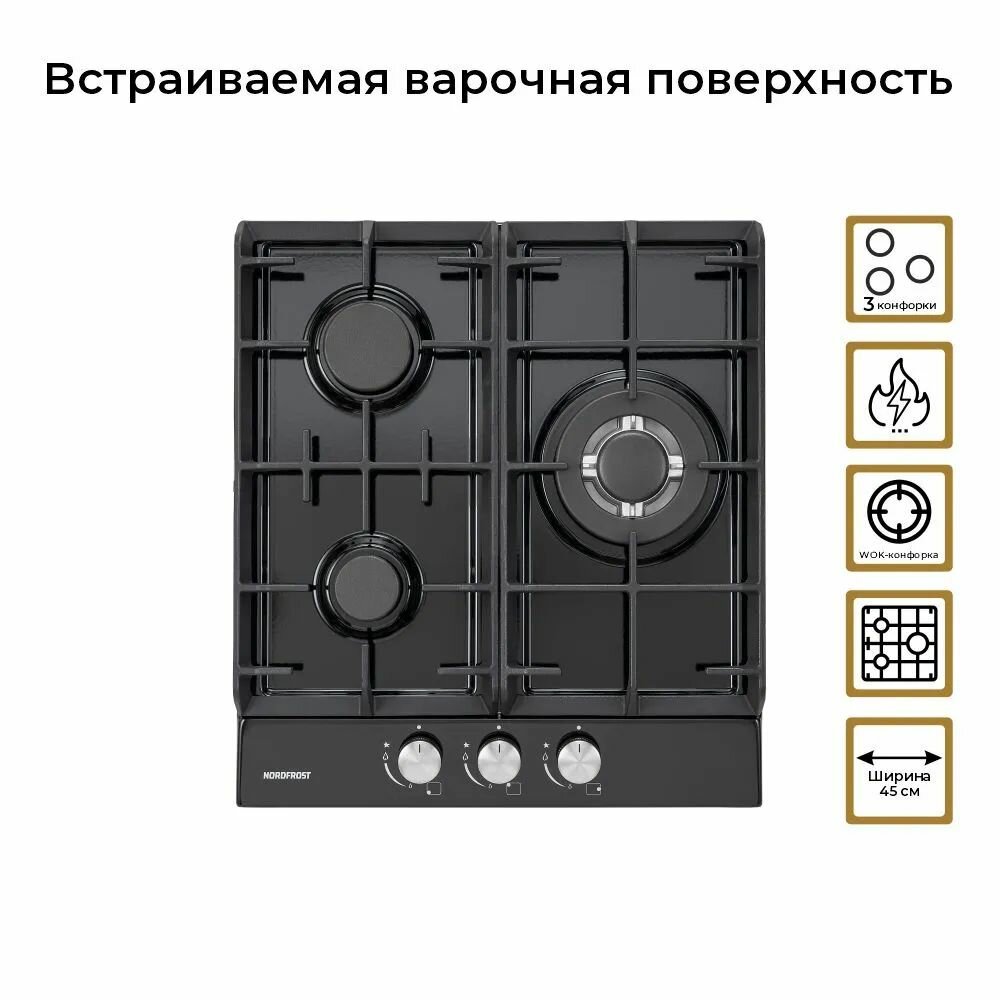 Газовая варочная поверхность NORDFROST HS 4532 B, электророзжиг, 3 конфорки, чугунные решетки, черная эмаль