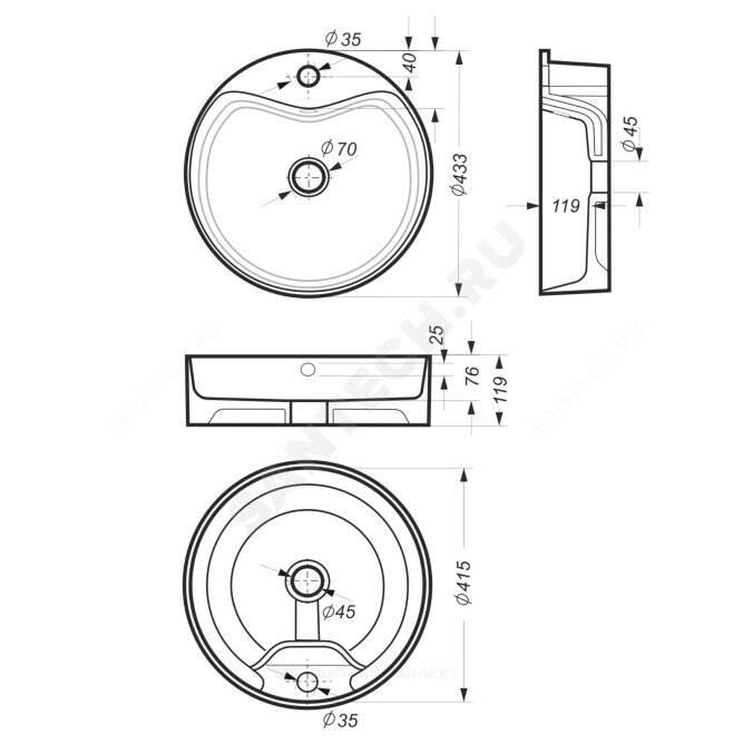 Умывальник Sanita Luxe BEST SHELF (Санита Люкс) d433 мм, накладной, белый