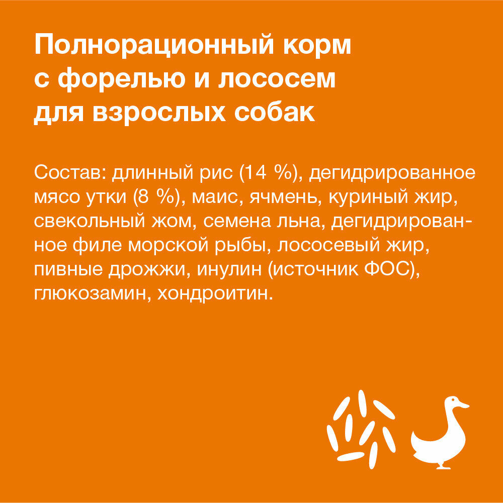 | Состав | длинный рис (14%), дегидрированное мясо утки (8% ), маис, ячмень, куриный жир, свекольный жом, семена льна, дегидрированное филе морской рыбы, лососевый жир, пивные дрожжи, инулин (источник ФОС), глюкозамин, хондроитин |