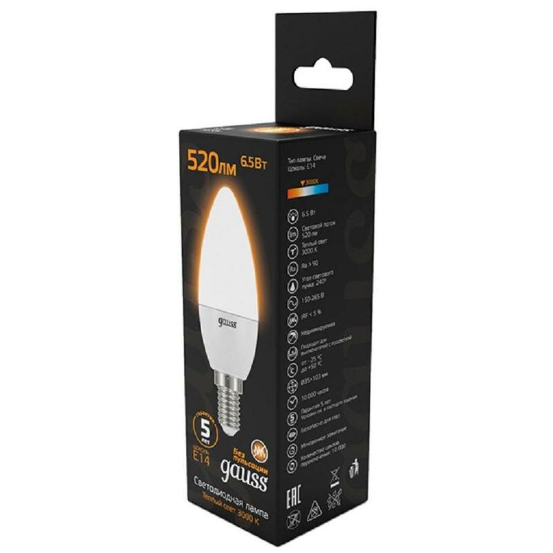 Лампа светодиодная Gauss 6.5Вт цок.:E14 свеча 220B 3000K св.свеч.бел.теп. 35-C (упак.:1шт) (10310110
