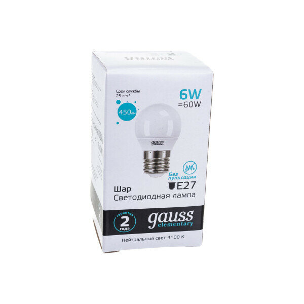 Лампа светодиодная Elementary 6Вт шар 4100К бел. E27 450лм 180-240В, GAUSS 53226 (1 шт.)