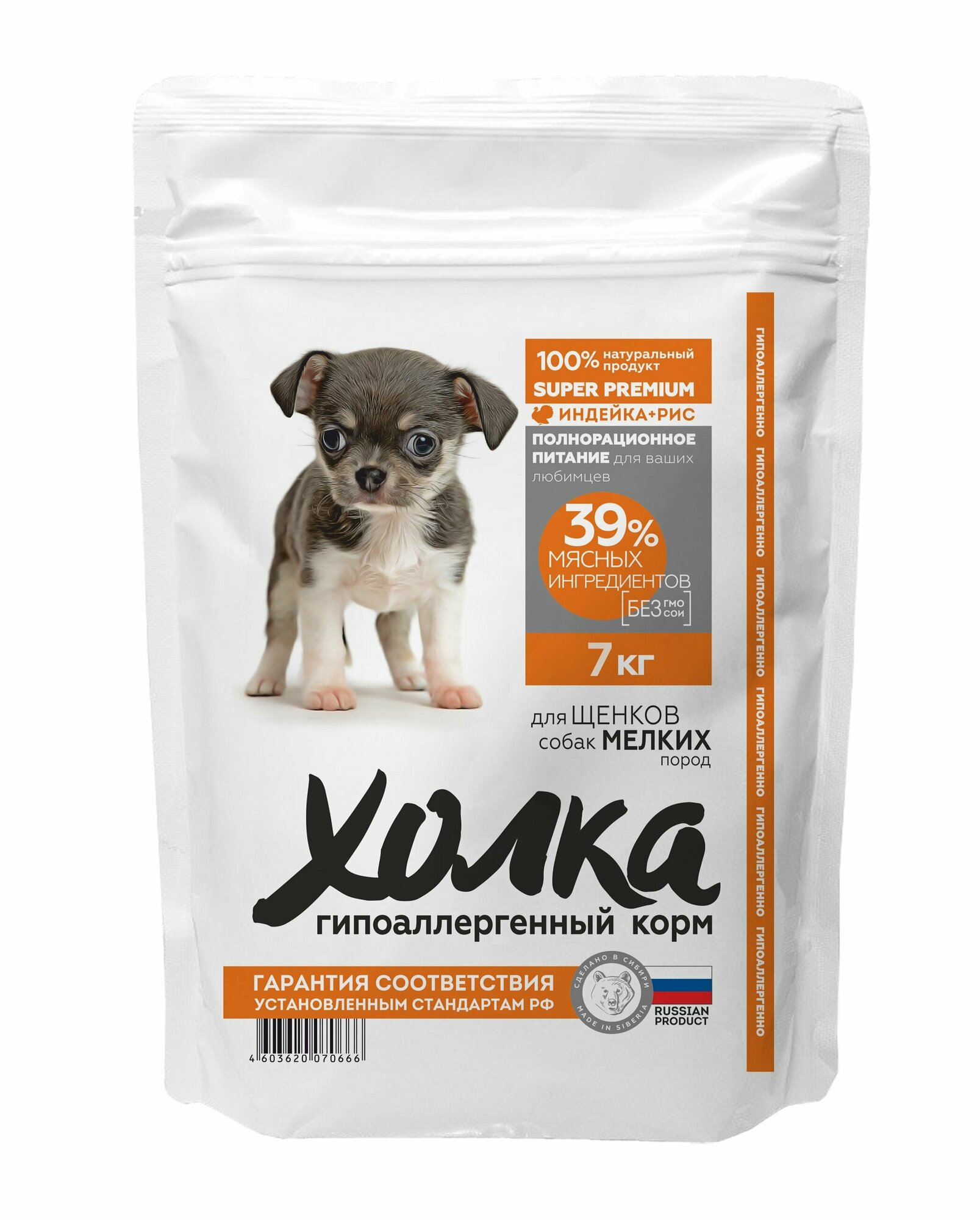 Гипоаллергенный полнорационный корм "Холка" для щенков собак мелких пород (39% мяса) из индейки и риса 15 кг