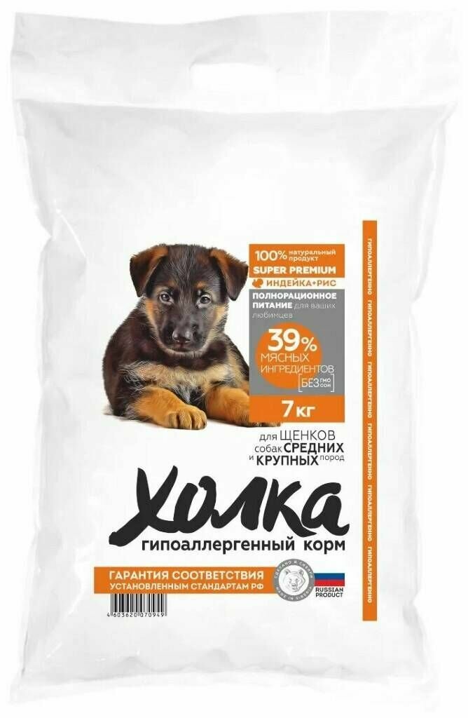 Гипоаллергенный полнорационный корм "Холка" для щенков мелких пород из индейки и риса, 7 кг