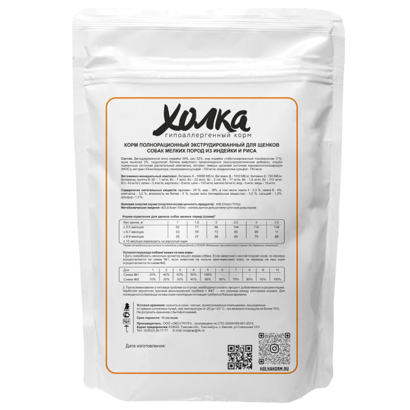 Корм холка гипоаллергенный премиум класса для щенков собак мелких пород с индейкой и рисом, 750 гр.