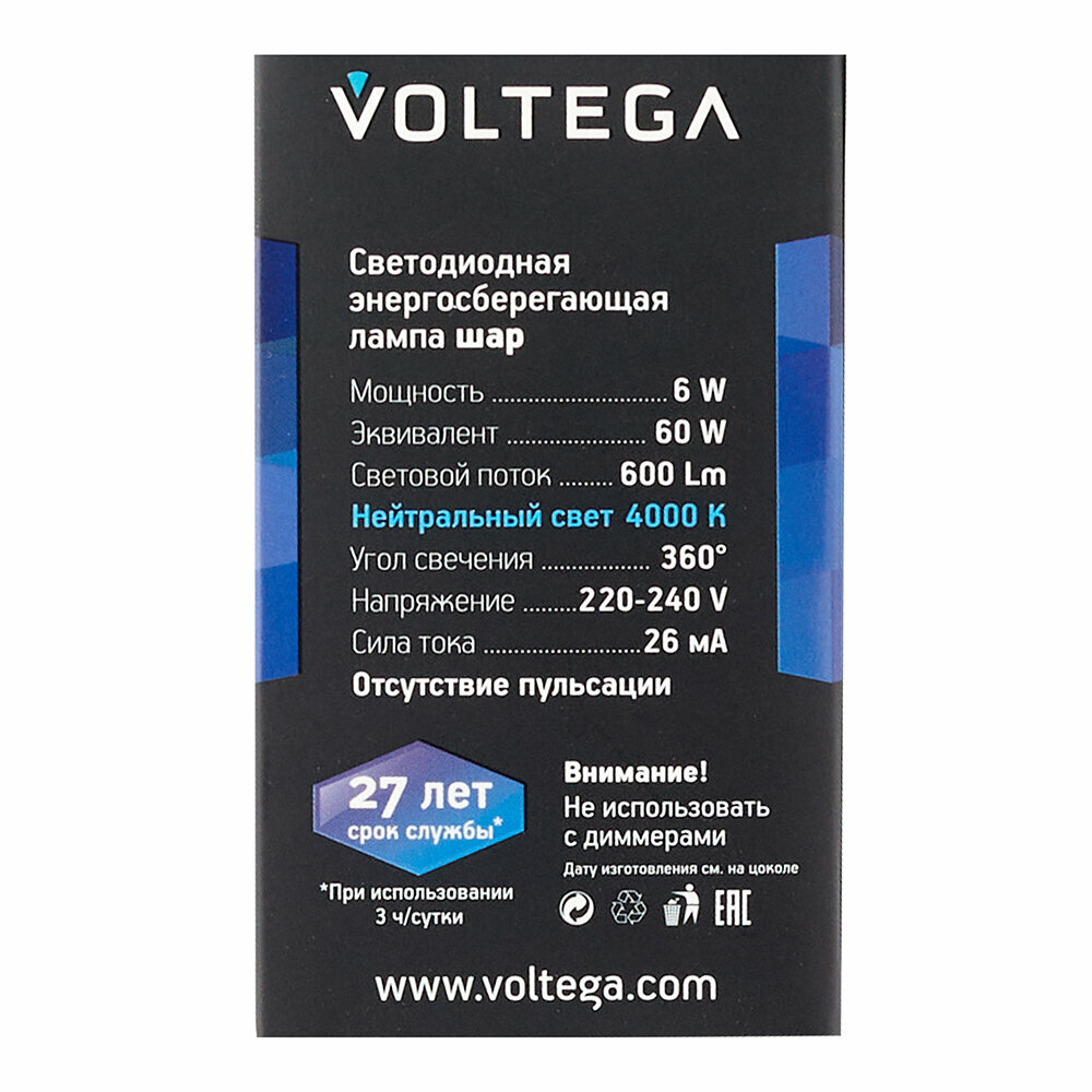Лампа светодиодная Voltega 7024, E27, G45, 6 Вт, 4000 К