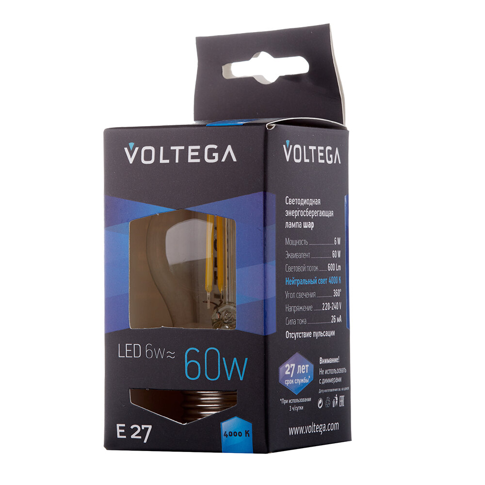 Лампа светодиодная Voltega E27 4000К 6 Вт 600 Лм 240 В груша прозрачная