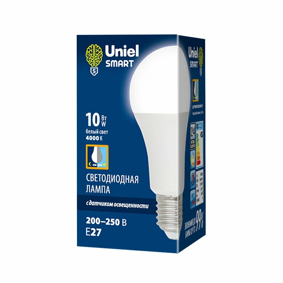 Светодиодная лампа Uniel, LED-A60-10W, 4000 K, E27, PS, PLS10WH, датчик освещенности