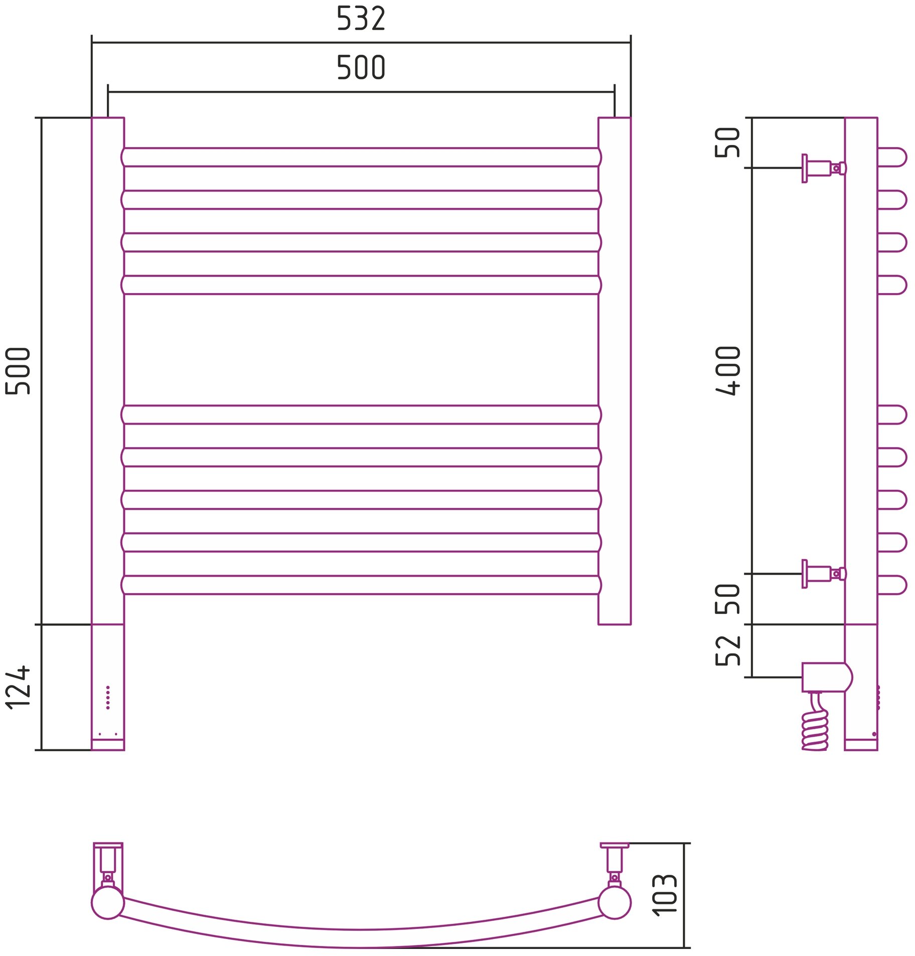 Сунержа Полотенцесушитель электрический Сунержа 15-5802-5050 Богема 3.0 РЭБ выгнутая, 500х500 мм/ МЭМ левый, муар темный титан