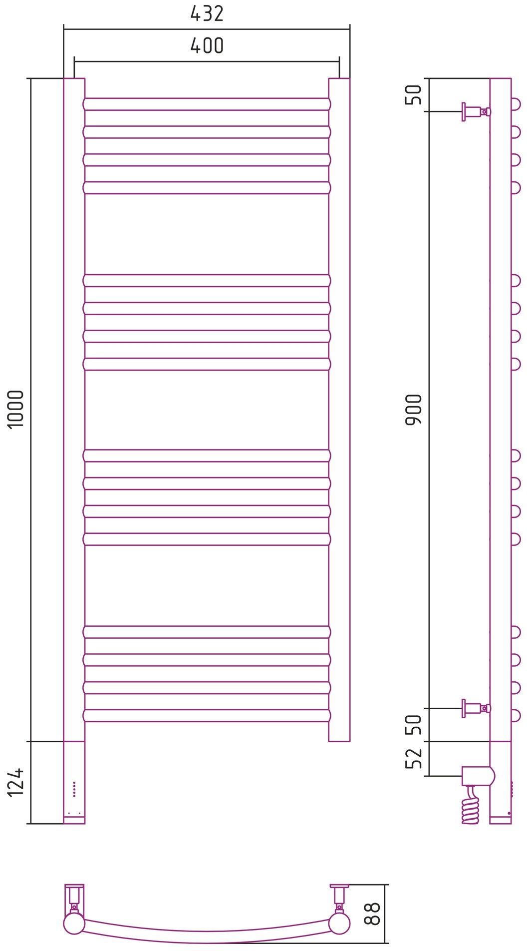 Полотенцесушитель электрический 1000x400 черный матовый МЭМ левый, перемычка выгнутая Сунержа Богема 3.0 31-5802-1040