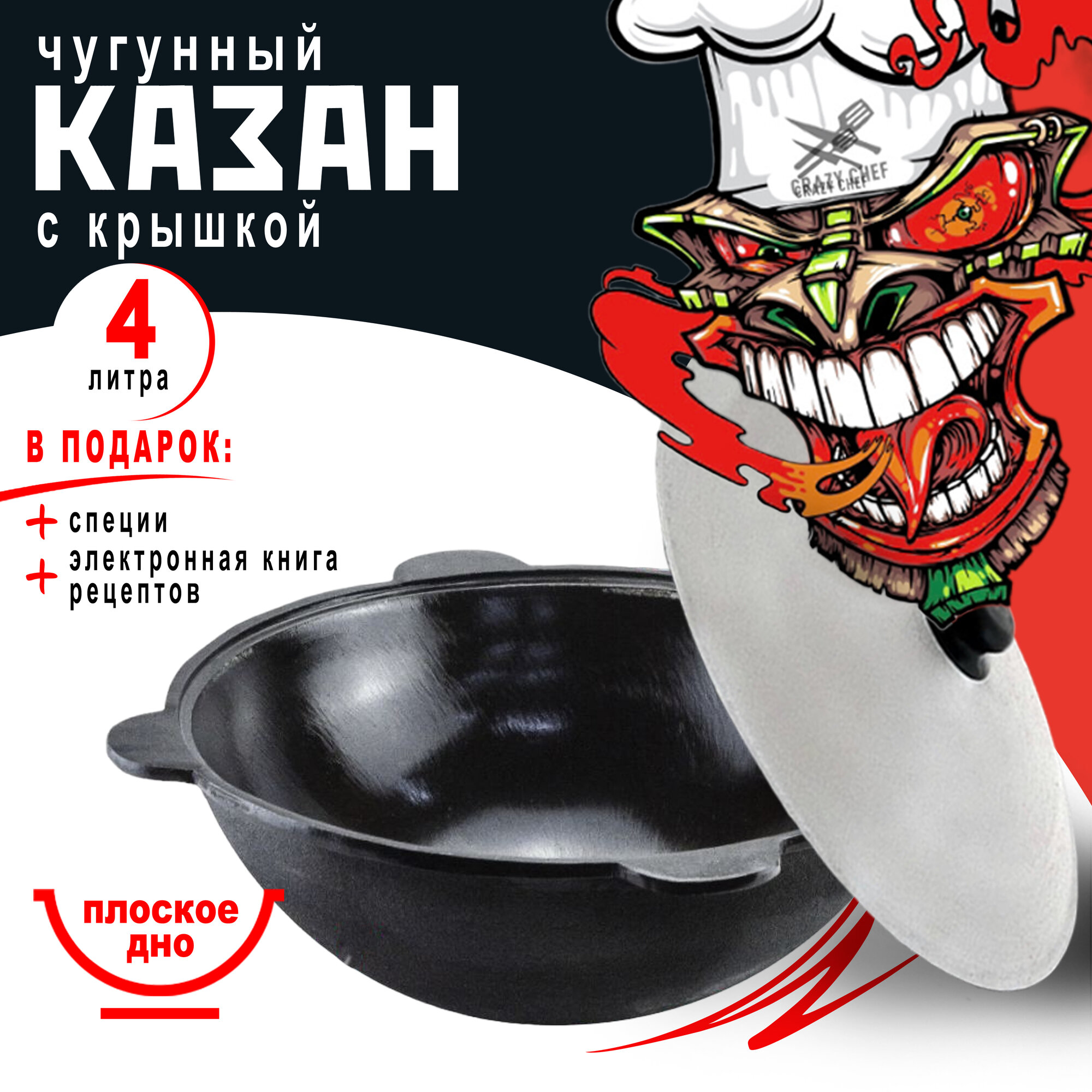 Узбекский казан чугунный Наманганский 4 л плоское дно, черный + специи и большая книга рецептов в подарок / чугунок / котелок узбекский / котелок для плова / казанок узбекский / казанок для плова