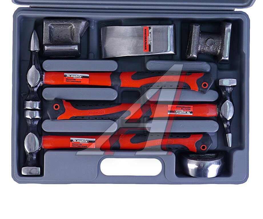 MATRIX Набор рихтовочный, 3 молотка с фибергласовыми ручками, 4 наковальни, в пласт. боксе// 10845