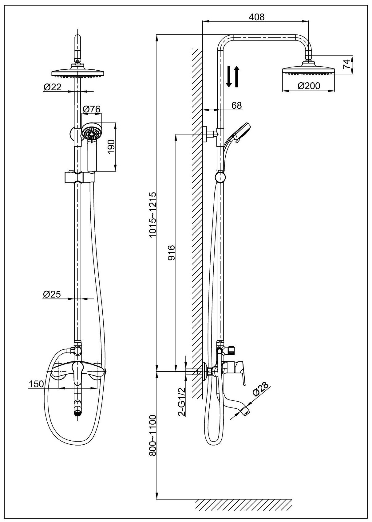 | Дополнительная информация | высота стойки для душа: 1215 мм; диаметр душевой лейки: 76 мм; диаметр верхнего душа: 200 мм |