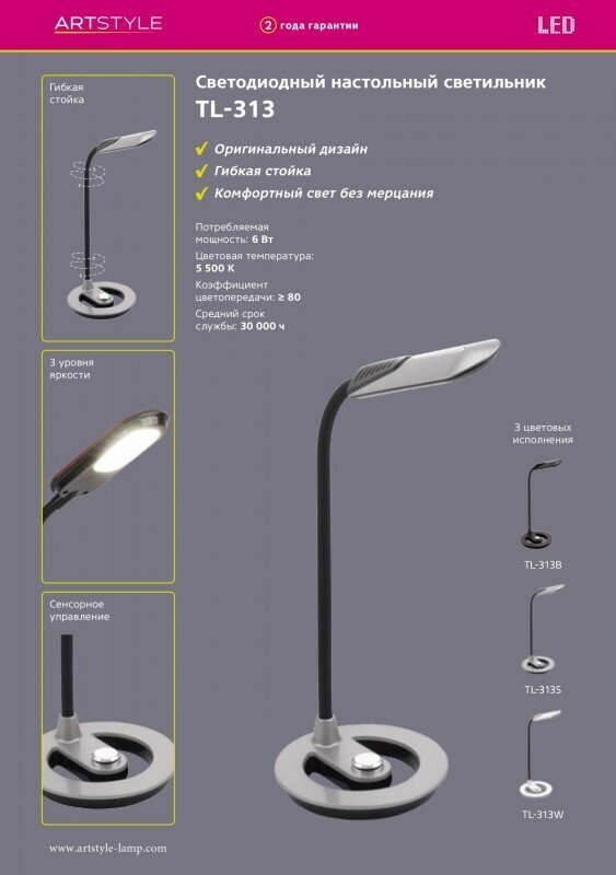 Светильник на подставке ARTSTYLE TL-313W, светодиодный, 6 W, 30000 часов, сенсор, 3 режима, белый - 1 шт.