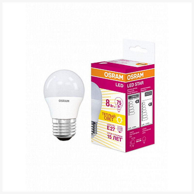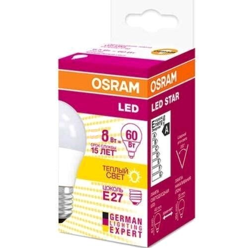 Лампа OSRAM LED Star E27 шар P (G45) 8Вт, светодиодная LED, 800 лм, эквивалент 75Вт, тёплый свет 3000К