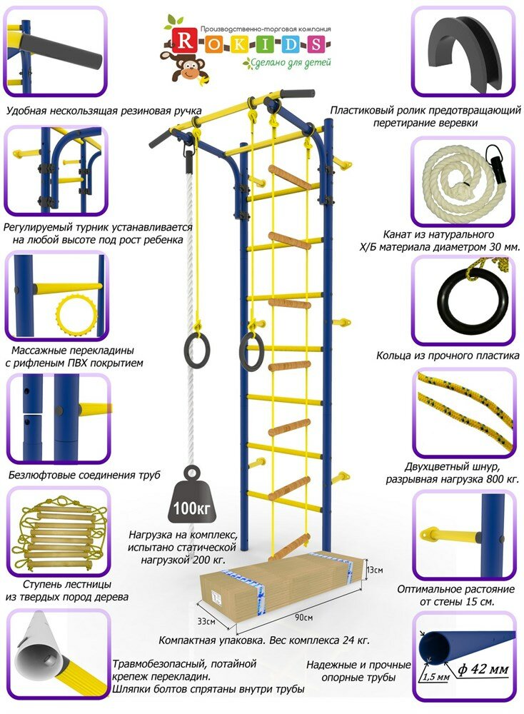 | Подробная комплектация | шведская стенка, турник регулируемый, кольца гимнастические, канат, веревочная лестница |