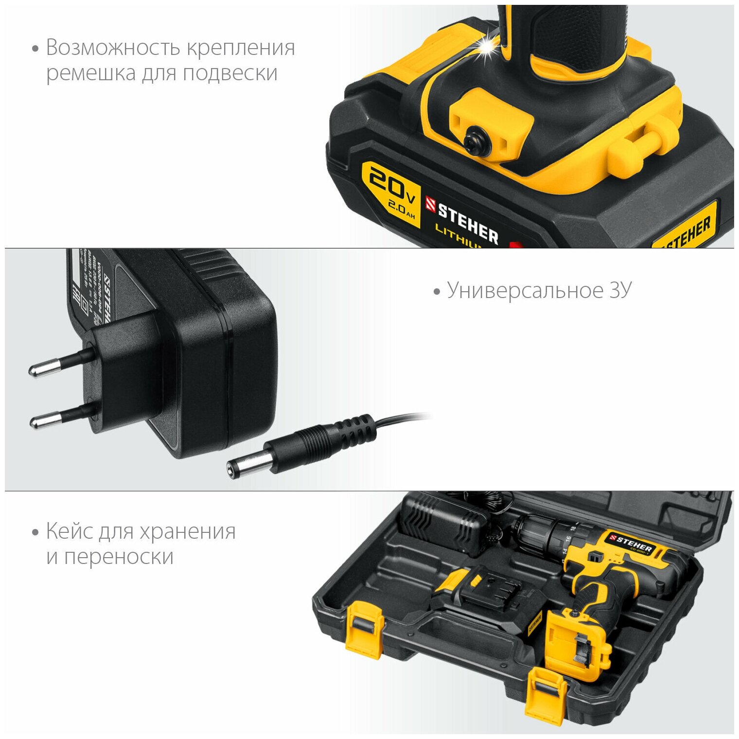 Шуруповерт аккумуляторный STEHER CD-200-1 20 В, 1 АКБ (2Ач), в кейсе