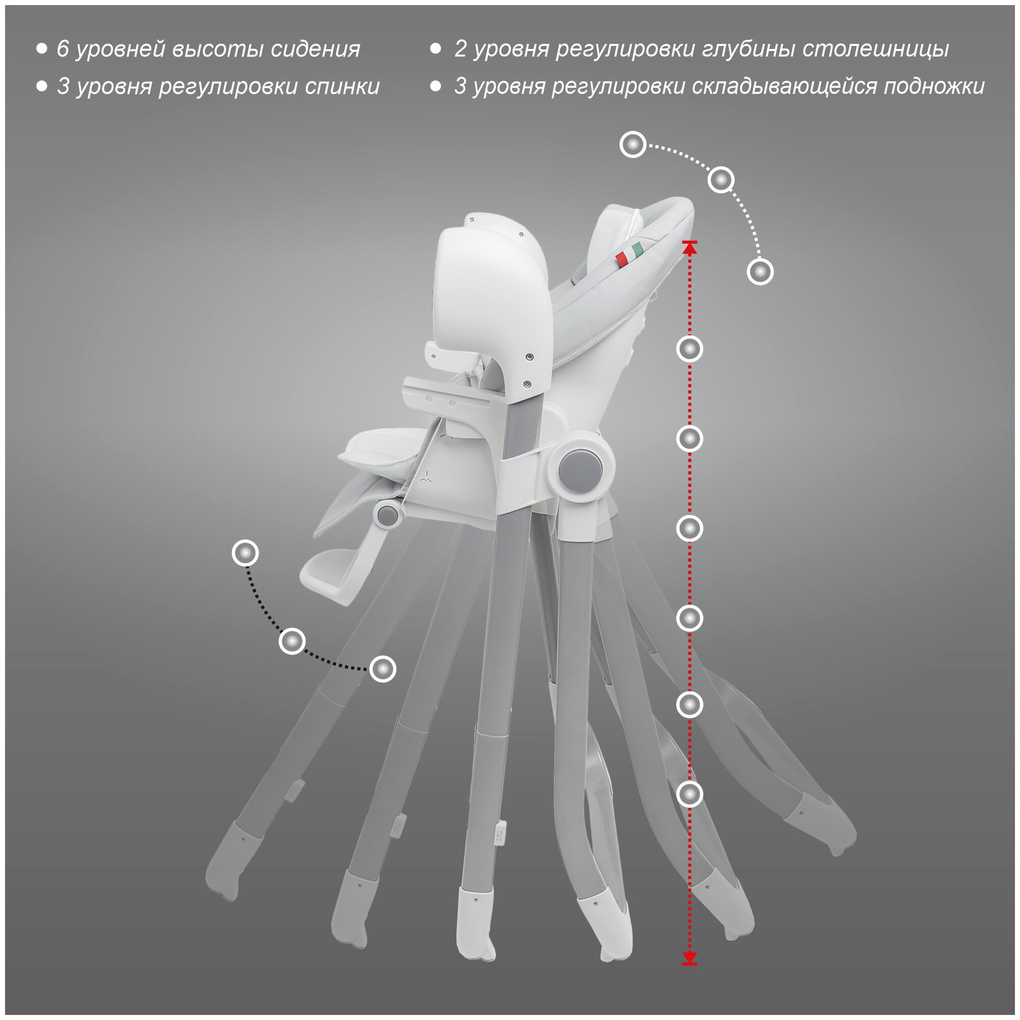 | Регулировка | высоты стульчика / наклона спинки / положения подножки |