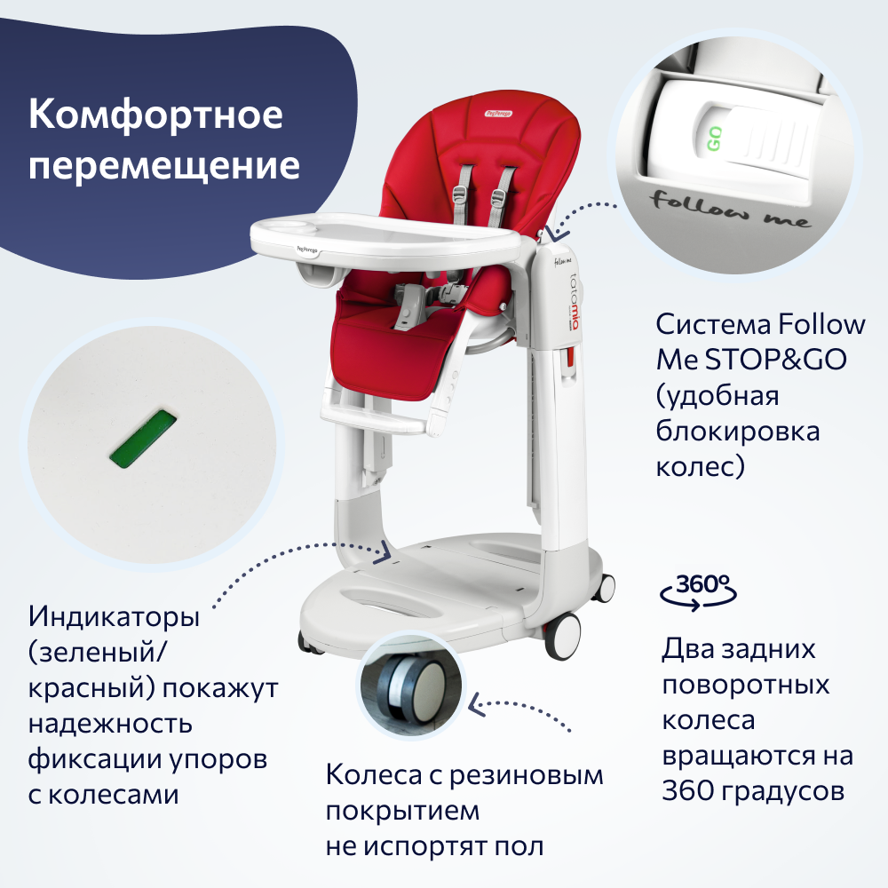 Стульчик для кормления Peg-Perego Tatamia Follow Me на колесах, регулировка спинки, сиденья и подножки, съемный столик, Ice серый New