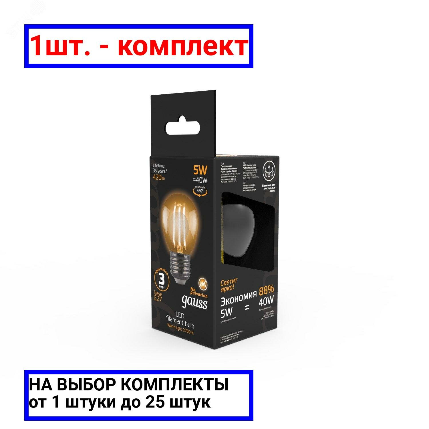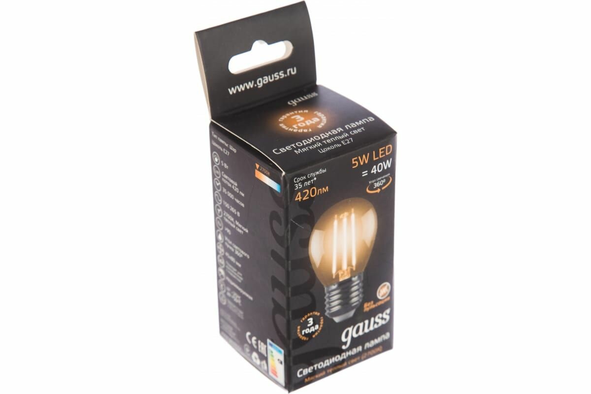 Упаковка ламп филаментная GAUSS E27, шар, 5Вт, 2700К, белый теплый, 10 шт. [105802105]