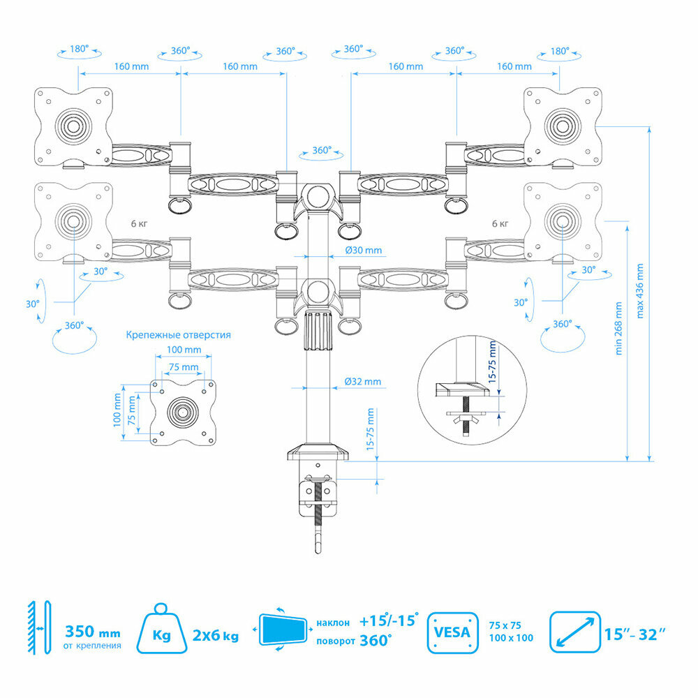 | Отзыв: | Пользуюсь с ~2014 года. Прижимная пластина (на струбцине) маловата - столешница хрустела, пришлось усилить деревяшкой. Толстые кабели (питание, VGA, DVI, плоские HDMI) не умещаются в кабель-каналах. Через год после установки левый монитор (24") начал наклоняться вниз, надо поправлять два раза в день. В остальном ок, хотя вот наклон подбешивает. |