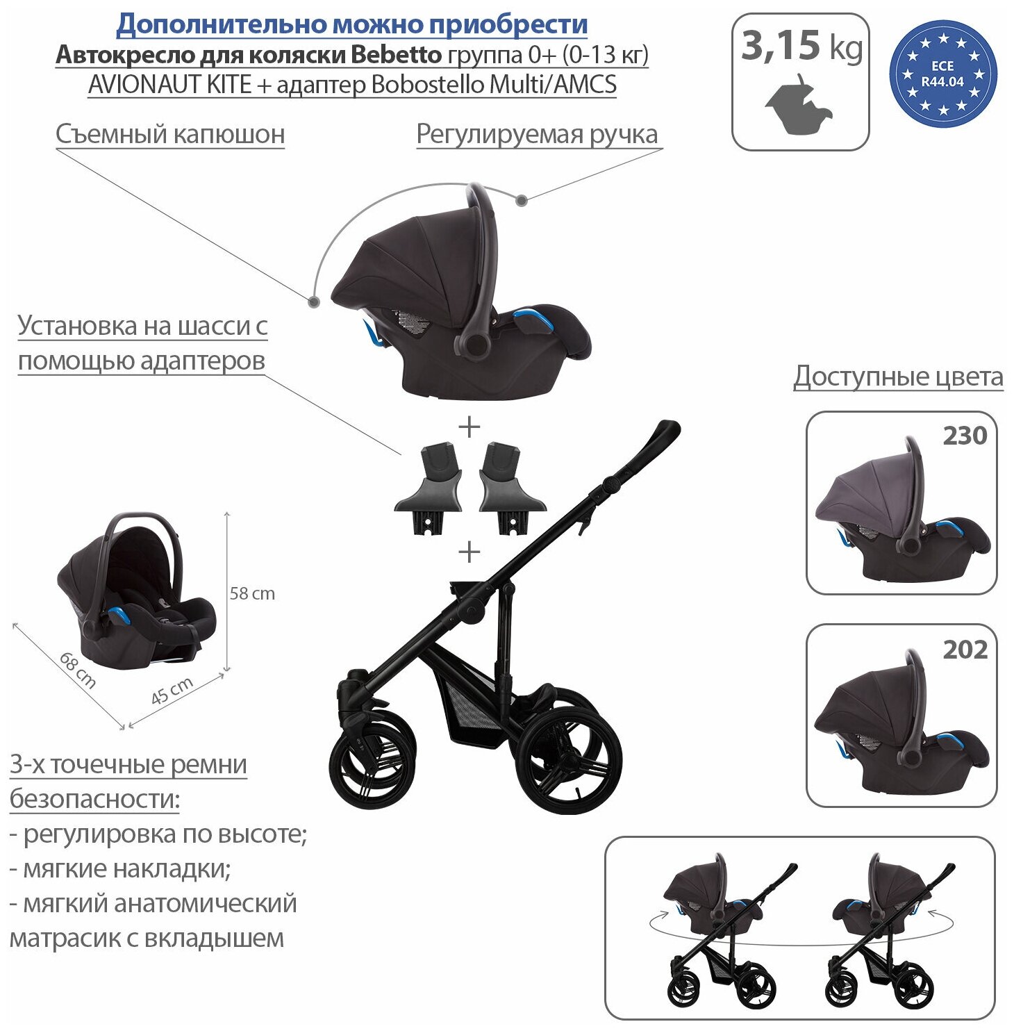 | Дополнительная информация | положение колес в сложенном виде: вниз; совместимость с автокреслом Bebetto Avionaut Kite, Bobostello Mars и адаптерами Bobostello Multi/AMCS, Bobostello Mars/ARAS |