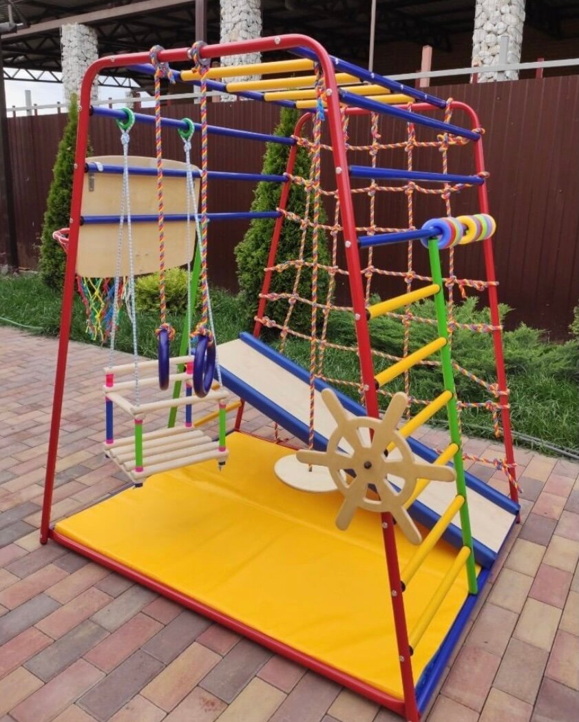 | В комплекте | веревочная лестница, гимнастические кольца, горка, канат, качели, мат, сетка для лазания, тарзанка, трапеция |
