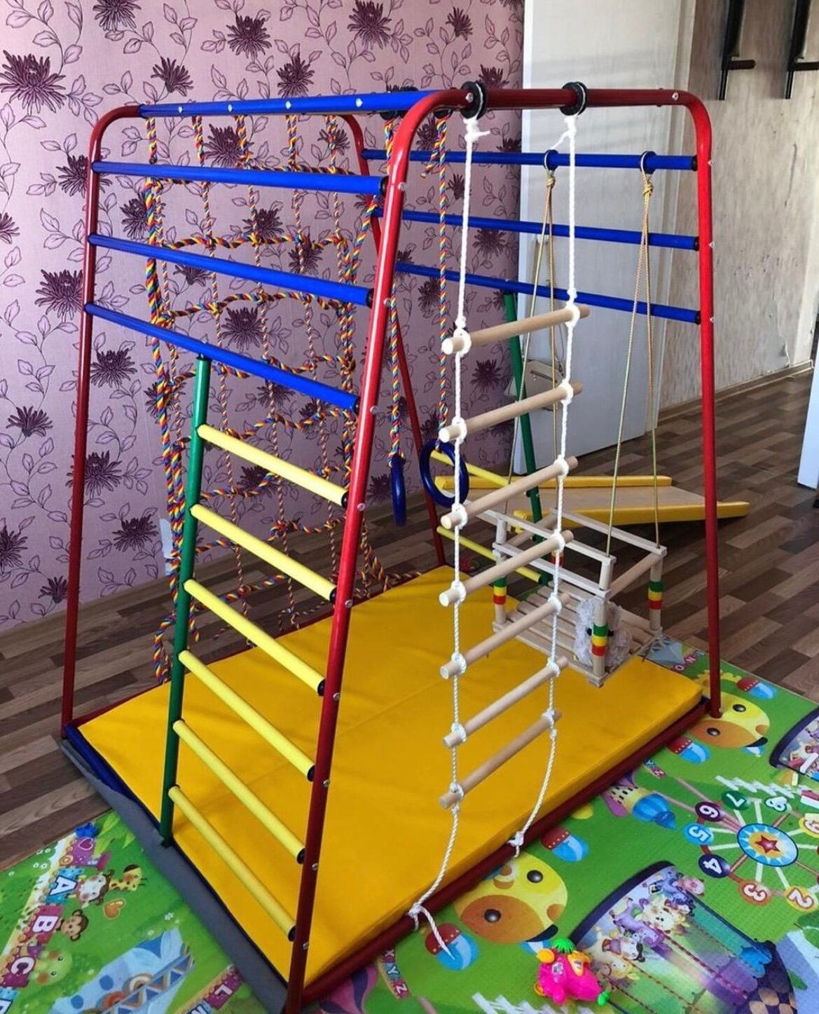 | Дополнительная информация | мат; горка с мягкими бортиками; количество горок: 1; количество качелей: 1; гимнастический мат складной: 0,95 х 1,25 х 0,04 м. (+/- 1 см); веревочная лестница 7 ступеней; материал мата: поролон, кожзам;нагрузка на один элемент конструкции: 30 кг |