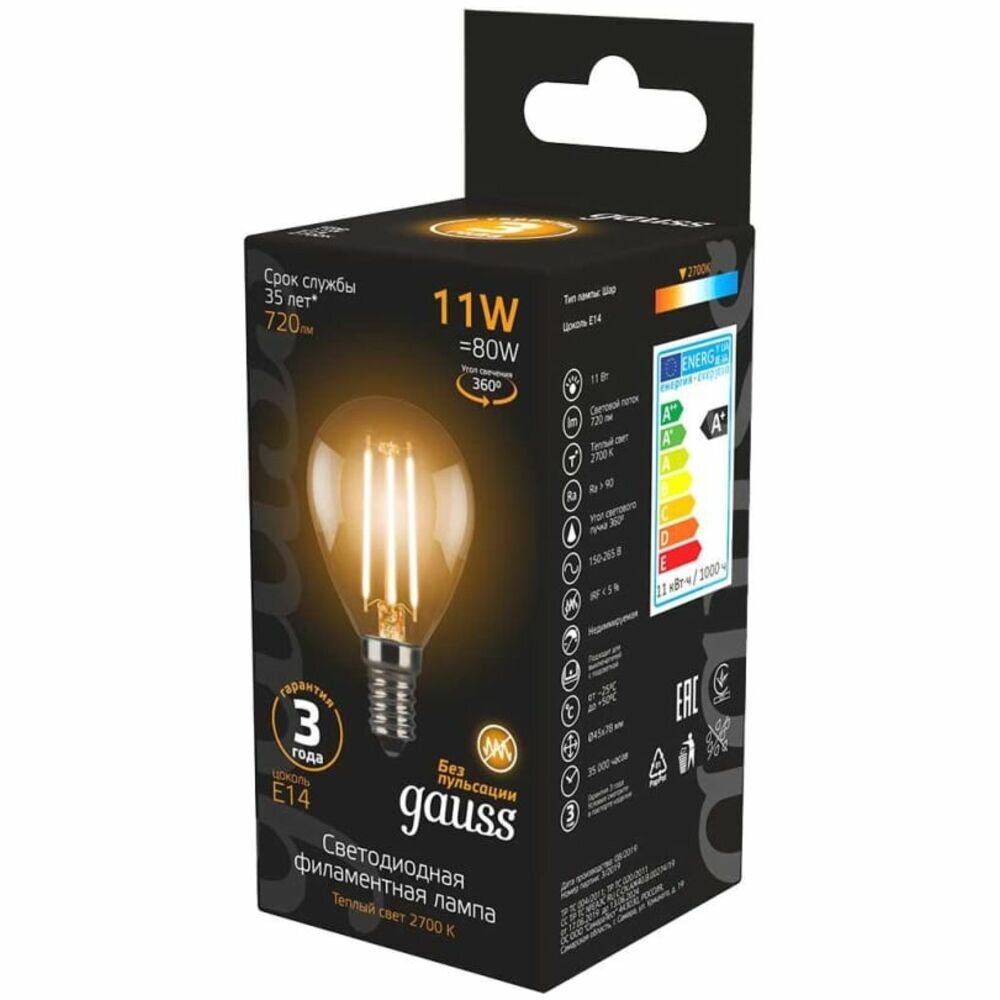 Лампочка светодиодная Е14 Шар 11W теплый свет 2700K упаковка 10 шт. Gauss Filament